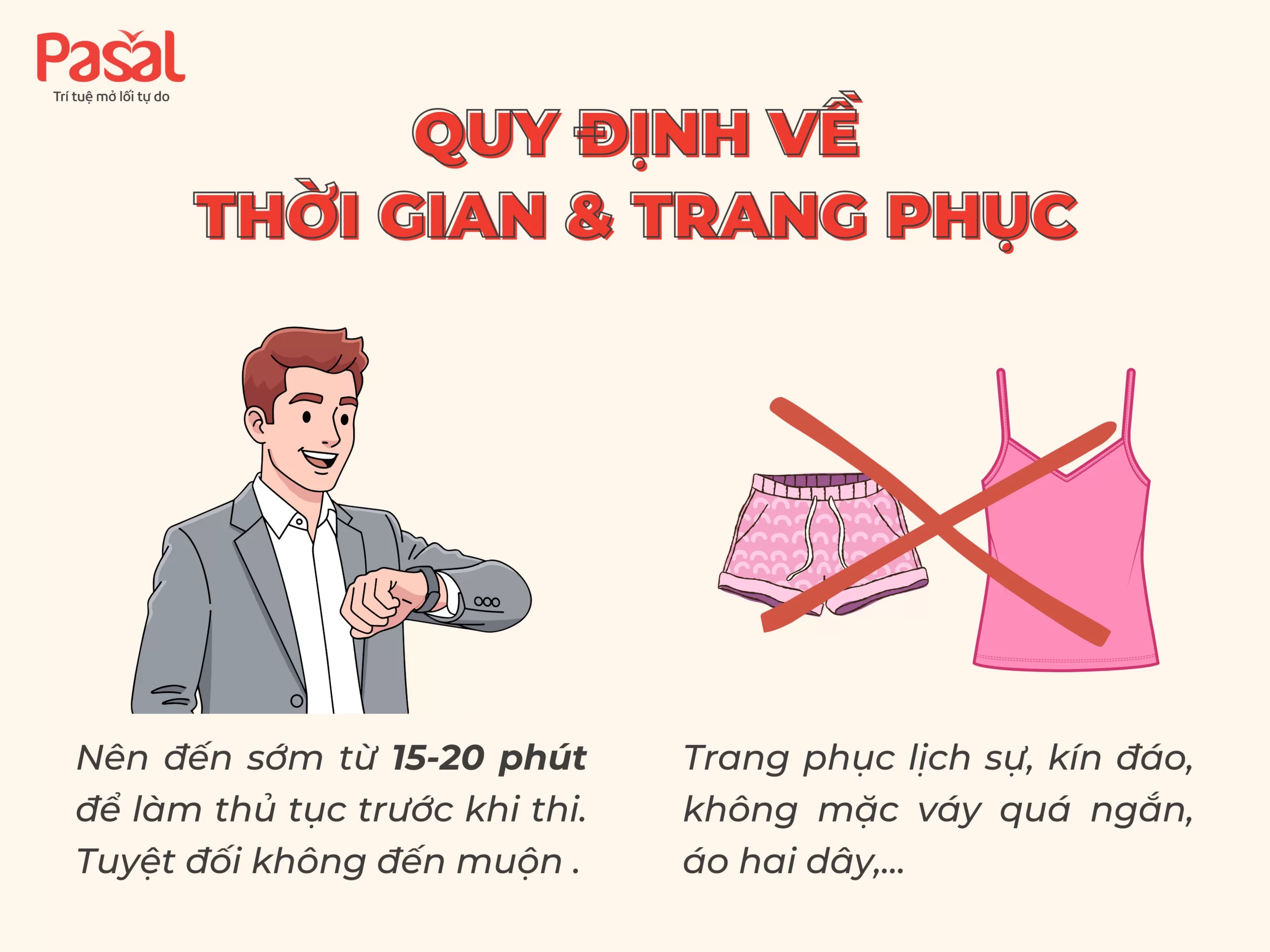 - Nam nữ đều cần mặc áo kín đáo, quần dài, không được mặc quần đùi, váy quá ngắn, áo ba lỗ hoặc trang phục không phù hợp môi trường thi cử.